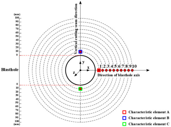 When traditional explosives are arranged eccentrically, the damage range of the coupled side increases, and the fracture zone decreases. The fracture zone on the uncoupled side increases, the damage range decreases, and the blasthole pressure is not evenly distributed. Due to the existence of the cutting seam pipe, the shock wave at the non-cutting seam direction can be buffered, but the force of the rock mass at the vertical cutting seam directly under the eccentric arrangement is not known. In order to study the impact dynamics behavior of rock mass elements on the coupled side and uncoupled side, a rock mass characteristic elements B and C, which are 10 mm away from the blasthole wall, are selected in the vertical cutting seam direction, and the arrangement of measuring points is shown in Figure 5.