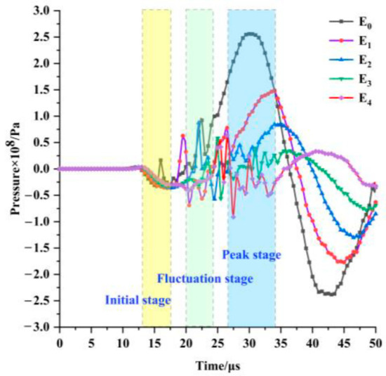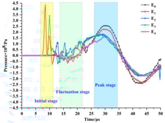 The effect of detonation products on the rock mass is very complicated. It is not strictly the dynamic effect of the explosive stress wave first, and then the quasi-static effect of the explosive gas pressure. Figure 6 shows the pressure-time interval curve of the measuring point under working condition. According to the pressure-time interval curve, the whole process is divided into 3 stages, namely the initial stage, the fluctuation stage, and the peak stage. During the explosion of explosives, the speed of shock wave propagation is higher than that of explosive gas [43]. In the initial stage, the detonation wave impacts the cutting seam pipe. The initial shock wave is formed at the cutting seam and rushes out along the cutting seam direction, and the initial shock wave disturbs the rock mass unit to a peak. In the fluctuation stage, the explosive gas, shock wave, and reflected wave act together. At this time, the wrapping property of the cutting seam pipe still exists. The existence of the reflected wave makes the rock mass to be repeatedly impacted, showing the effect of fluctuation in the pressure-time history curve. In the peak stage, the cutting seam pipe continuously expands and contacts the blasthole wall. The cutting seam pipe gradually loses its wrapping property to the detonation products. The detonation products are released comprehensively, transferring a large amount of energy to the surrounding rock mass, and the rock mass pressure gradually reaches the peak value.
