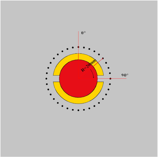 When the cutting seam cartridge explodes, explosive gas and detonation waves rush out along the cutting seam pipe, and initial cracks are formed in the blasthole wall at the cutting seam, which continues to expand under the action of subsequent explosive gas. Part of the detonation products flows around the cutting seam pipe and acts on other parts of the blasthole wall. In order to study the effect of detonation products on the initial crack under the condition of the eccentric and uncoupled arrangement, and to verify the correctness of the above conclusions. Circumferentially select the air element at 4 mm outside the cutting seam pipe. The measuring points are arranged as shown in Figure 18, and the cutting seam direction is 90° and 270°.