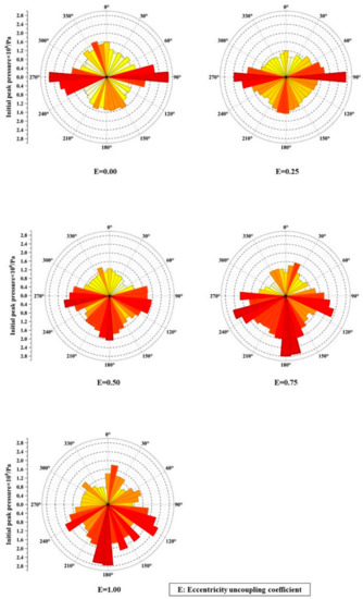 Figure 19 shows the initial pressure peak in the form of a bar graph, showing the distribution of the initial pressure on the air characteristic element under ~ working conditions. The stress field generated by the detonation product after the explosion is symmetrical about the vertical cutting seam direction. In and working conditions, the eccentric uncoupled coefficient is small, and a large number of detonation products are punched out vertically along the cutting seam direction (90°, 270°), impacting the rock mass element to form the initial cracks. The initial pressure vertical to the cutting seam direction (0°, 180°) is second only to the cutting seam direction, which is formed by the convergence and superposition of the left and right circumfluence gas and part of the shock wave. With the increase of the eccentric uncoupled coefficient, the detonation products punched out of the cutting seam direction in the range of 90°~120° and 240°~270°, forming a larger stress concentration on the coupled side.