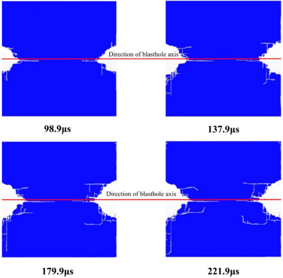 The cutting seam pipe has a guiding effect on the initial crack. Figure 21 shows the crack propagation under the working condition. In the initial stage of the explosion, the detonation products in the cutting seam direction impacted the rock mass, and the resultant force was greater than the tensile strength of the rock, resulting in cracking and forming several initial cracks. The non-cutting direction has a buffering effect, and only micro-cracks are produced. The working condition is a completely eccentric uncoupled arrangement, the cutting seam pipe on the coupled side is in contact with the blasthole. The initial crack diverges from the axis of the blasthole and expands continuously. The detonation energy is unevenly distributed on the coupled side. The crushing zone and the fracture zone on the coupled side of the blasthole are larger than the uncoupled side, which is quite different from the conclusion of the traditional eccentric uncoupled cartridge. When the cutting seam cartridge is eccentrically arranged without coupling, a small amount of under-excavation will occur at the axis of the blasthole, which will cause less disturbance to the rock mass on the uncoupled side. If in actual blasting, the coupled side is reserved rock mass, the eccentric uncoupled arrangement will cause greater over-excavation and damage.