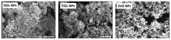 SEM (scanning electron microscopy) photomicrographs of SiO2 NPs (nanoparticles) deposited on the substrate formed the agglomerates consisting of the tangled chains with the particle size ranging from 10–20 nm, spherical shape of TiO2 NPs with an average crystallite size of about 20 nm and ZnO NPs with an average size of 100 nm. Scale bar: 500 µm.