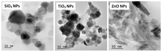TEM photomicrographs of SiO2, TiO2 and ZnO NPs. Highlighting the spherical shape in case of SiO2 and TiO2 NPs. ZnO NPs showing rod-shaped structures.