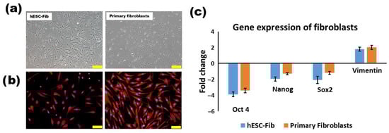 Characterization analysis of hESC-Fib (human embryonic stem cell-derived fibroblast): (a) Phase contrast microscopic image of hESC-Fib and primary fibroblasts cultured on gelatin-coated tissue culture plate. Phase contrast images show the spindle-shaped morphology of cells; (b) Immunofluorescence-stained photomicrographs of hESC-Fib and primary fibroblasts expressing the presence of Vimentin in red and DAPI stained nucleus in blue; (c) Real-time PCR of hESC-Fib compared to primary fibroblasts and both cells were also checked for expression of pluripotent genes. Levels of expression were normalized by corresponding GAPDH values, an internal control. Scale bar: 200 μm.
