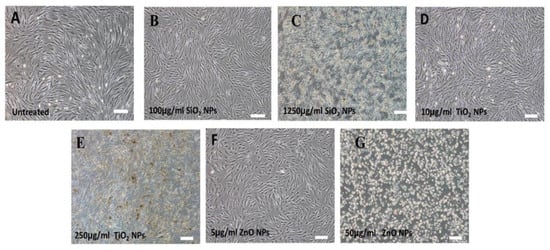 Phase contrast images of hESC-Fib cells taken after 24 h treatment of NPs, where (A) was considered as control i.e., cells with no NP treatment (untreated group). This figure also highlights the cell disruptions upon treatment of lower and higher concentrations of SiO2 (B,C), TiO2 (D,E) and ZnO (F,G) NPs. Scale bar: 100 μm.