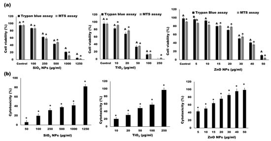 For trypan blue assay, cells were treated with respective concentrations of metal oxide NPs for 24 h and stained with trypan blue dye. The number of live and dead cells were manually counted using hemocytometer and cellular viability was expressed as percentage of viable cells.