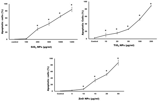The percentage of cells undergoing apoptosis/necrosis was investigated using flow cytometric analysis (Figure 6). Annexin-V and Propidium Iodide staining kit (Alexa Fluor®, ThermoFisher Scientific, Waltham, MA, USA) was used to analyze the cell apoptotic profile. Cells treated with ZnO NPs have shown apoptosis at 5 µg/mL. Approximately 20%–30% of cells were viable under 20 µg/mL concentration group, whereas cells treated with TiO2 and SiO2 NPs have shown lesser viability only in higher concentrations, i.e., 100 µg/mL and 500 µg/mL respectively. Figure 6 depicts the gradual increase in apoptotic cell population with gradual increase in NP concentration. Flow cytometry analysis graphs are mentioned in Supplementary Materials Figure S1. All the tested NPs at higher concentrations have induced apoptosis in hESC-Fib cells (p ≤ 0.05 and p ≤ 0.001). Thus, ZnO NP-treated cells showed strong apoptotic response as compared to TiO2 and SiO2 NPs.