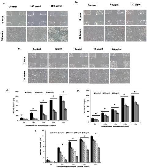 Wound healing scratch assay showing the cell proliferation and migration capability when treated with SiO2 NPs (a,d); TiO2 NPs (b,e) and ZnO NPs (c,f). (* represents statistical significance compared to control).