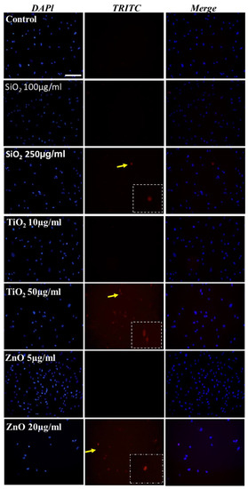 Furthermore, NPs have been tested for genotoxic effects such as chromosomal aberration, DNA strand breaks, oxidative DNA damage, mutations, and some commonly used NPs are proven to be genotoxic at certain concentrations [39]. We performed DNA damage assay under in vitro conditions on NP-treated hESC-Fib cells. As presented in Figure 8, ZnO NPs at 20 µg/mL have shown changes in nuclear morphology and prove to be a distinct genotoxic response. In the DNA damage assay, genotoxic response is generally measured by TRITC signals and nuclear changes observed among the treated cells. Among three NPs, SiO2 NPs showed negligible TRITC signals at 250 µg/mL upon 24 h treatment. However, TiO2 and ZnO NPs showed strong TRITC signals. In the near future, studies will be planned to evaluate the sub-cellular changes in hESC-Fib cells by TEM imaging and for genotoxic response by real time PCR and Western blotting.