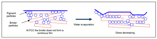 (a) Water evaporation and coating layer consolidation—when the coating is transformed into porous layer which can withstand certain stresses and first critical concentration (FCC) is achieved (Figure 1). The first critical concentration is defined as the solids level where surface gloss begins to decrease rapidly. This is the point where the water excess has been removed from the coating to break the suspension; the pigment particles have formed a semirigid network, which, through restricted consolidation, supports capillary conduction to the evaporation surface.
