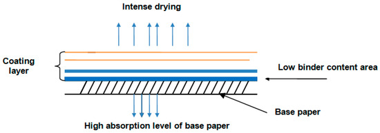 Generally, a coated paper is a layered composite consisting of a paper base covered on both sides with a porous clay-based polymer coating. The coating is applied on the paper surface to improve the gloss, smoothness, optical properties, and printability of the coated paper. The drying of the coated paper is an important stage to obtain a coating layer with a consolidated and appropriate structure and has a great influence on the properties of the coated surface (i.e., gloss, smoothness, printing density, or surface strength). However, besides the coating composition, the type and binder level [1], the pigment shape and size distribution, the properties of the base paper [2], and the coating structure and properties are influenced by the consolidation upon drying [3].