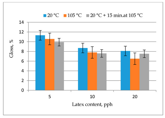 At a high drying temperature (105 °C) and latex content (20 pph), the latex “melting” phenomenon is intensified and the shrinkage of the coating layer causing the appearance of destruction on the coated surface, which decreases the surface gloss (Figure 6).