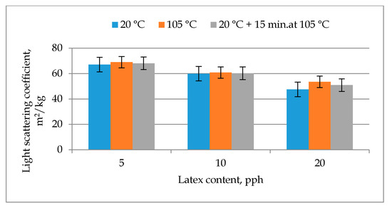Regarding the light scattering (Figure 9), it can be observed that, at the same latex content in the coating formulation, this parameter is intensified as the drying temperature is increased. The effect is more important at higher latex contents in the coating formulation, although the void fraction is reduced. This can be explained as follows: at high drying temperatures, during latex film formation the particles deform and merge with each other more and more as the latex content in the coating formulation becomes higher. In this case, the pores size in the coating layer structure increases even if the total volume of pores is lower. The change in the pore size when the latex is fully “melted” has the result of the increasing the light scattering for the samples dried at 105 °C and the samples with post treatment drying for 15 min at 105 °C after drying at 20 °C.