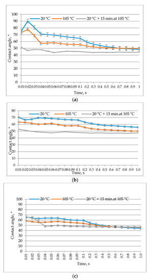 The influence of drying conditions on the contact angle of the coated paper samples: (a) 5 pph latex content; (b) 10 pph latex content; (c) 20 pph latex content.