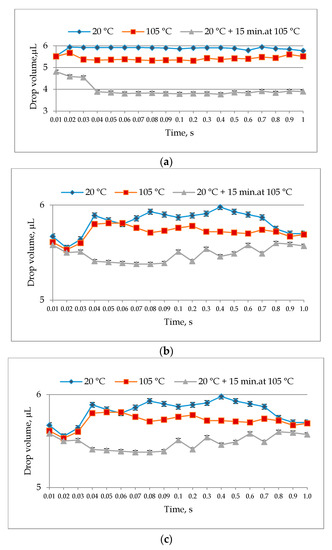 To assess the coating layer wetting capacity, the dynamic contact angle was measured using an automatic device (FibroDat 500/1100, Messmer Buchel, Fokerstrat, The Netherlands) according to the Tappi T558 pm method [27]. The method is based on an image analysis of a water drop (with a specified volume of about 6 µL) in contact with the substrate of a coated paper samples at specified time intervals. The rate of contact angle changes, and the volume and base diameter (spreading on the sample surface) of the water droplet are calculated as time functions.