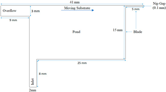 A schematic representation of the SDC with its geometrical dimensions is presented in Figure 1. The coating color from a distribution system is fed into the pond via the inlet channel located at the bottom of the pond. The coating color is picked up by a fast-moving paper web (moving substrate) mounted on the backing roll. A doctor blade element is positioned at the downstream side of the pond, where the excess in the pond follows the contour of the boundary formed by the doctor element and leaves the pond. The nip gap controls the thickness of the coating layer and its uniformity under the balance of the viscous and elastic forces.