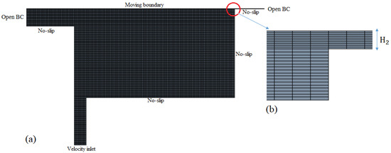 For visualization of the refined mesh over the entire domain, a magnified view of the computational domain along with the boundary conditions is shown in Figure 2. Four different computational meshes were used for the SDC to assess numerical accuracy. Figure 2b gives a view of a small portion of mesh 4 at the entry of the narrow channel where the smallest cells were registered along the narrow channel, and their size expanded slightly and uniformly to other regions of the domain. Mesh 4 was an extremely refined mesh for such a small computational domain, not only along the downstream channel but also across the domain as several small vortices appeared at the corners and along with the moving paper boundary.