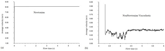 In this study, a segregated solution algorithm was used as the numerical method with a control volume technique [37]. This algorithm offers an advantage over the alternative methods, providing strong coupling between pressure and the velocities as the segregated solution reduces oscillations and convergence problems in velocity and pressure fields. The semi-implicit method for pressure-linked equations (SIMPLE) is used for coupling the velocity and pressure [38]. The quadratic upwind interpolation (QUICK) scheme is a higher-order method that can minimize false diffusion of errors and is used to discretize the governing system of equations; however, the method is computationally less stable [39]. While the first/second-order method is always bounded and provides stability for discretization of the pressure-correction equation, it produces erroneous results when the flow is not aligned with the grid lines. The first-order implicit algorithm is then used for discretizing the temporal part of the governing system of equations. The residual values or mass imbalance was tested and set as 10−6. In all the simulation cases, the average velocity at the exit of the narrow channel with imposed open boundary condition was monitored to ensure convergence and consistency of the solutions. Figure 4 shows how the average velocity in the Newtonian models attained absolute steady-state, while with the non-Newtonian viscoelastic cases, the average velocity presented minor fluctuations with flow time at the exit of the blade channel.