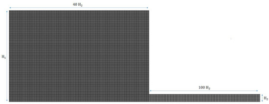Flow in axisymmetric 12:1 contraction channel was used as the test case to validate the viscoelastic models against the numerical results reported by Oliveira et al. [29]. Figure 5 shows a magnified view of the refined and uniform computational grid near the contraction plane. For the characterization of viscoelastic fluid flow, the Deborah number De, (defined as De = (λU2)/H2) was used, where U2 and H2 are the average velocity and the height in the downstream channel, respectively. For the viscoelastic models, two relaxation time constants, i.e., 3 × 10−3 and 3 × 10−5 s, were used to calculate the Deborah number De = 200 and De = 2, respectively.