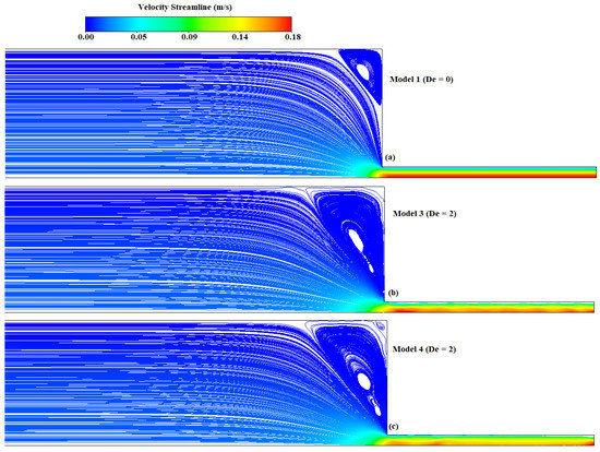 In Figure 6, the results obtained for the Newtonian model (model 1) (De = 0), constant viscosity, Oldroyd-B model (model 3) (De = 2), and the shear-thinning Giesekus model (model 4) (De = 2) are presented in terms of the magnitude of velocity contour plots. By a qualitative comparison with the numerical results reported by Oliveira et al. [29], vortex enhancement was observed for the viscoelastic models due to the combination of shear-rate-dependent viscous and elastic effects (Figure 6b,c). A higher Deborah number was studied for the SDC (discussed in the following sections), which was geometrically similar to the contraction design except for the fact that the base boundary was not stationary. A detailed discussion of the viscoelastic and Newtonian fluid flow through contraction channels is well documented elsewhere [40].