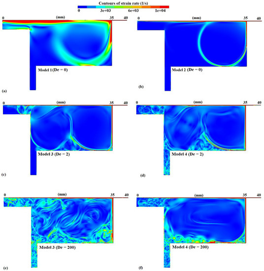 Strain rate distribution for (a) model 1, (b) model 2, (c) model 3 (De = 2), (d) model 4 (De = 2), (e) model 3 (De = 200), and (f) model 4 (De = 200).