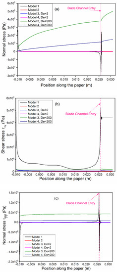 Figure 10b shows the shear stress development along the surface of the paper. It is clear that shear stresses were significantly more dominant in model 1, where no elastic properties of the fluid were considered. However, the magnitude of the shear stresses in model 2 was significantly reduced due to shear thinning. For models 3 and 4 at De = 2, the observed minor increase in the shear stress significantly damped the shear stress development predicted by model 1 due to elasticity effects. For higher Deborah number (De = 200), an additional increase in the shear stress profile was observed for model 3 as the flow became highly elastic; however, the shear-thinning action predicted by model 4 displayed an intermediate behavior between models 2 and 3. Hence, the development of shear stresses in the region before the blade channel entry has significantly lower impact for fluids displaying shear thinning and highly elastic behavior, in contrast to purely viscous fluids. Figure 10c shows the distribution of the y-normal stress component along the length of the paper. It is evident that the polymer chains experienced stronger extension with increasing Deborah number in a longitudinal direction [46] and the shear thinning acted as a damping factor.