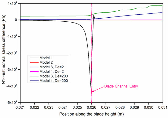 First normal stress difference distribution along the blade height.