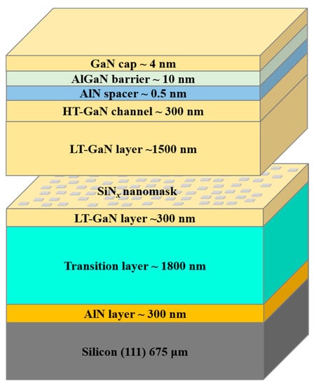 - Lee, H.-P.; Perozek, J.; Rosario, L.D.; Bayram, C. Investigation of AlGaN/GaN high electron mobility transistor structures on 200-mm silicon (111) substrates employing different buffer layer configurations. Sci. Rep. 2016, 6, 37588. [Google Scholar] [CrossRef] [PubMed]
