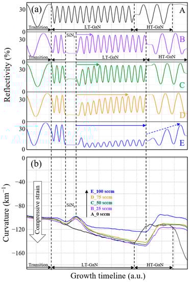 The in situ monitoring of the reflectivity and surface curvature of all five samples is shown in Figure 2. The growth rate and surface morphology of the samples during the epitaxial growth could be evaluated from the reflectivity measurement (Figure 2a). Before the SiNx nano-mask growth, the growth rate of ~4.2 μm/h of the 300 nm thick LT-GaN initial layer of all samples was indicated from the dependence of reflectance oscillation on the growth time. During the SiNx nano-mask insertion, the reflectance intensity of the samples was extinguished and flattened because of depositing 3D SiNx nanocrystals. Then, the maximum intensity of the oscillation peaks was gradually restored during the 1.5 μm LT-GaN overlayer growth, where the required time to recover the reflectance peak intensity to maximum, as before the SiNx deposition, was different between the inserted SiNx samples. Obviously, the recovering time, marked as the length of colored arrows in Figure 2a, increased with increasing the SiH4 flow rate. In other words, the time required for the growth mode transition from 3D-island to 2D-coalescence of the LT-GaN overlayer strongly depends on the SiH4 flux, in which transition time increases with the amount of SiH4 flux used. It is also emphasized that this transition could not complete if the SiH4 flow rate exceeds a threshold of 75 sccm, as in the case of sample E. Indeed, the reflectivity at the end of the LT-GaN overlayer of this sample only equals ~40% as compared to that at end of the LT-GaN underlayer. However, the following high-temperature GaN (HT-GaN) channel layer growth of this sample exhibited a fast restoration in the reflectivity only after three oscillation cycles (see blue-dash arrow in Figure 2a, sample E). This result suggests that the SiH4 flux modulation during inserting SiNx interlayer is a considerable approach in terms of recovering the 2D growth mode of the HT-GaN layer even if a SiH4 flux as high as 100 sccm is used.