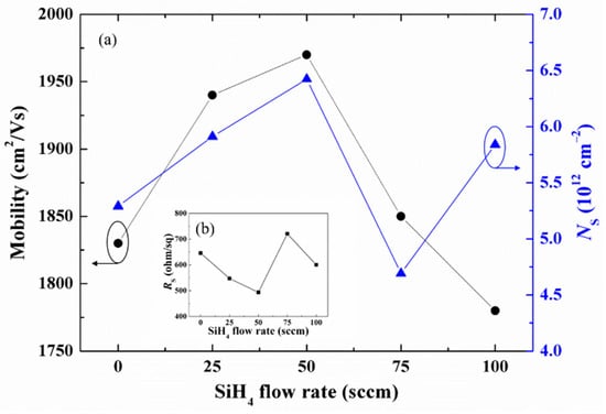 (a) Mobility and NS of the 2DEG structure as a function of the SiH4 flow rate. The inset (b) shows the dependence of sheet resistance (RS) on the SiH4 flow rate.