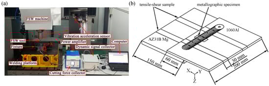 In this study, the FSLW welding tests were carried out using a 2 mm-thick 1060 aluminum plate and a 3 mm-thick AZ31B magnesium plate. The dimensions of the plates were 200 mm × 150 mm, and the chemical compositions are shown in Table 1. Prior to welding, the dust and greasy dirt on the surface of the aluminum and magnesium plates were removed with sandpaper and alcohol. All the specimens were constructed on an HT-JM16 × 8/1 one-dimensional gantry friction stir welding machine (Aerospace Engineering Equipment Co., Ltd., Suzhou, China) with the aluminum plate on top and the magnesium plate at the bottom. To ensure an effective joint between the aluminum and magnesium plates, a tool of pin diameter size 4 mm and shoulder diameter size 14 mm, was chosen. In the welding process, the tool rotated in a counterclockwise direction and maintained a 2.5° angle and a 0.2 mm shoulder plunge depth. Welding parameters were set as separately at ω = 1000, 1500, and 2000 rpm and ν = 30, 50, and 70 mm/min. In addition, to study the effect of the dynamic performance of the spindle on microstructures and properties of the joint, the real-time changes of the three forces and the vibrations of the spindle were monitored separately during the welding process using a Kistler 9257B three-component cutting force system (Kistler Instruments Co., Ltd., Wintertour, Switzerland) and DH5922D vibration instrumentation (Jiangsu Donghua Testing Technology Co., Ltd., Taizhou, China) (Figure 1a). The three-way acceleration sensor of 1A314E was used; the X, Y and Z direction sensitivity was 104.2, 100.1 and 99.3 mV/g, respectively. The frequency range was 0.5–7000 Hz. To examine the macroscopic characteristics of the weld, a cross section of the weld was extracted from the middle position and, after polishing, examined under a Zeiss Axiovert 200MAT stereo microscope and a Zeiss Lab A1 microscope (Zeiss, Jena, Germany). A micro-hardness tester (FM-810, Future-tech, Kawasaki, Japan) was used to test the cross-sectional micro-hardness of the joint, with a load of 100 gf and a loading time of 15 s. The tensile specimens were taken from 5 cm away from the start of the joint with a size of 190 mm × 40 mm (as shown in Figure 1b), and the joint tensile shear force was measured using a microcomputer-controlled electronic universal testing machine (WDW-20, Changchun Kexin Test Instrument Co., Ltd., Changchun, China) at a quasi-static loading speed of 0.5 mm/min.