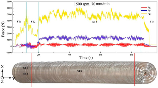 In the FSLW process, the interaction between the spindle and the specimen during the forming process of the weld may be divided into four phases: the plunging stage (I), dwelling stage (II), welding stage (III), and pulling-out stage (IV) [22]. The spindle experiences different forces in different phases. For example, the time dependence of the three forces on the spindle under the FSLW welding parameter of 1500 rpm and 70 mm/min are shown in Figure 3. From Figure 3, it can be seen that the red, blue and yellow line represent the Fx, Fy and Fz, respectively.