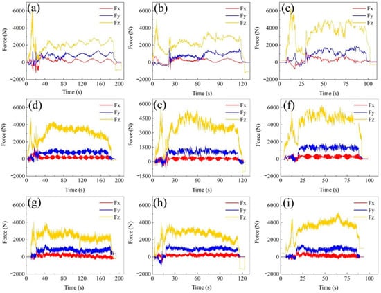 The three directional forces during the FSLW process stage. (a) 1000 rpm, 30 mm/min; (b) 1000 rpm, 50 mm/min; (c) 1000 rpm, 70 mm/min; (d) 1500 rpm, 30 mm/min; (e) 1500 rpm, 50 mm/min; (f) 1500 rpm, 70 mm/min; (g) 2000 rpm, 30 mm/min; (h) 2000 rpm, 50 mm/min; (i) 2000 rpm, 70 mm/min.