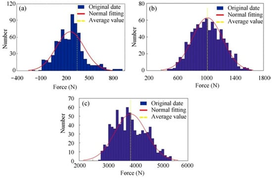 Normal distribution curve fitting of the forces when ω = 2000 rpm and ν = 30 mm/min: (a) Fx, (b) Fy and (c) Fz.