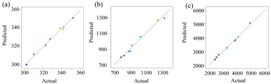 Using the ANOVA module of the Design Expert 12.0 software, the accuracy of the response surface model was tested. In the analysis of variance process, the values of P and F reflect the reliability of the model. The greater the values of F, the smaller the values of P were, and the higher the reliability of the model was. Generally, a P value less than 0.05 indicates that the model is significant, and a P value greater than 0.1 shows that the model is poor and cannot be used reliably. The results in Table 5 show that the Fz response surface model and the v, ω, and v2 terms were all highly significant. In addition, the closer the coefficient of determination, R2, between the actually measured value of the response surface function and the predicted value of the model was to 1, the better the fit was between the predicted and experimental values. In the Fz model, R2 was as high as 0.98, which indicated a high degree of fitting between the predicted and experimental values. Figure 6 shows the correlation graphs of experimental and predicted values. From Figure 6, it was found that the predicted and experimental values of the response surface function were evenly distributed on both sides of the 45° inclined line, indicating that the response surface models of Fx, Fy and Fz had high fitting accuracy and the models were applicable.