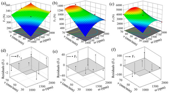 Figure 7 shows the response surface plots for the rotational speed, welding speed to the forces Fx, Fy and Fz. Figure 7a shows that the variation trend of Fx was clearly different from those of Fy and Fz. When ω = 1000 rpm and v = 30 mm/min, Fx exhibited the minimum value. As the rotational and welding speed increased, Fx increased and assumed the maximum value when ω = 2000 rpm and v = 70 mm/min. On the XY horizontal plane of the response surface plot, the contour line for Fx was approximately a circular arc. This indicated that the rotational speed and the welding speed interacted very weakly with Fx and had only an overlaying effect. Furthermore, over the entire variation range of the fitted parameters, Fx fluctuated in the range of 300–360 N, and the welding process parameters had little effect on the changes of the Fx values [34]. Similarly, the Fy also obtained a minimum at ω = 1000 rpm and v = 30, and the interaction dropped sharply as it approached 1000 rpm and 30 mm/min. In Figure 7b, the rotational and welding speeds had an interacting effect on Fy [35]. For a given rotational speed, as the welding speed increased, Fy increased. For a given welding speed, when the rotational speed increased, Fy first increased and then decreased, with the maximum occurring at approximately ω = 1500 rpm and v = 70 mm/min. As shown in Figure 7c, Fz was approximately symmetric about the horizontal plane of ω = 1500 rpm. At v = 30 mm/min, Fz decreased sharply as the rotational speed approached 1000 and 2000 rpm, reaching a maximum at ω = 1500 rpm and v = 70 mm/min. On the XY horizontal plane, the contour had an elliptical shape, and the interaction of the rotation and welding speeds with Fz was quite significant. Under this interaction, Fz changed minimally for ω = 1300–1700 rpm and v = 40–60 mm/min. Residual plots are shown in Figure 7d–f, which indicate that the fitting accuracy of all experimental date was up to 97%, and the experimental analysis was dependable.
