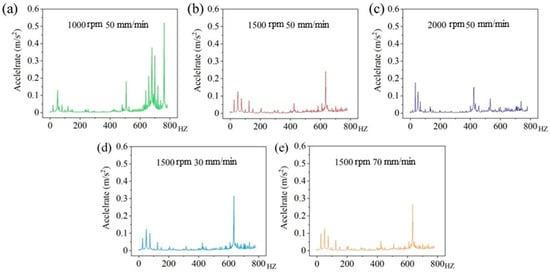 Vibration acceleration frequency spectra in the direction of Z. (a) 1000 rpm, 50 mm/min; (b) 1500 rpm, 50 mm/min; (c) 2000 rpm, 50 mm/min; (d) 1500 rpm, 30 mm/min; (e) 1500 rpm, 70 mm/min.