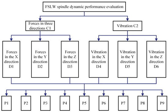Based on the known evaluation indices, it was determined that there were four layers: object layer O, criterion layer C, sub-criterion layer D, and program layer P. An analytic hierarchy process diagram, as shown in Figure 10, was established. The first layer, object layer O, was for the evaluation of the FSLW spindle dynamic performance. The second layer, criterion layer C, had the two first-level indices—the three forces and vibration—to evaluate the dynamic performance of the FSLW spindle. The third layer, sub-criterion layer D, had second-level indices (six indices including Fx, Fy and others) for evaluating the dynamic performance of the FSLW spindle. The fourth layer contained the nine sets of weld process parameters studied herein.