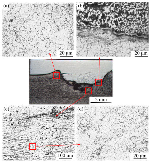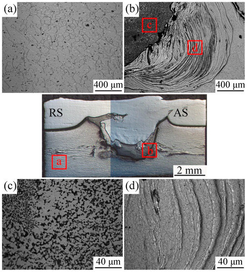 The microstructure of P1 and P7 are shown in Figure 11 and Figure 12, respectively. From Figure 11a and Figure 12a, coarse grains can be observed in the Mg sheet. Figure 11b and Figure 12b show the interface of the Al and Mg sheets. Islands of a globular phase were observed at the boundary in the stirring zone with similar morphologies to IMCs and base materials, which has been discussed by Mohammadi [36]. In the stirring zone, a “swirl zone” can be observed from Figure 11c and Figure 12c, which shows that the materials are well mixed. The magnified views of a small region in Figure 11c and Figure 12c are shown in Figure 11d and Figure 12d, where this stirring zone indicated that grain size decreases significantly after recrystallization. However, from Figure 12b, a thick IMC layer at the weld interfaces, and a hook defect appear in macrostructure of Figure 12 can also be observed. It is clear that the higher heat input causes a more severe formation of intermetallic compounds. The presence of intermetallic compounds and hooks can reduce the mechanical properties of the joint.