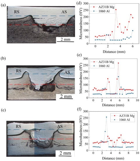 Cross-sectional appearance and micro-hardness of the joint: (a,d) P1, (b,e) P5, and (c,f) P7.