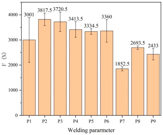 Figure 14 shows the tensile-shear strengths of different parameter. For welds produced at 1000 and 1500 rpm, the average failure load, more than 3000 N, was obtained for FSLW produced under 30, 50 and 70 mm/min. In comparison, the average failure load of ~2693.5 N was observed using a travel speed of 2000 rpm and the welding speeds of 30, 50 and 70 mm/min. When the rotation speed was fixed as 1000 and 2000 rpm, respectively, the mechanical properties of the joint first increased and then decreased with the increased welding speed. However, the mechanical properties of the joint slightly changed when the rotation speed was fixed as 1500 rpm. Based on the tensile-shear forces F, the mechanical property for each parameter was ranked in order of merit as follows: P2 > P3 > P4 > P6 > P5 > P1 > P8 > P9 > P7.