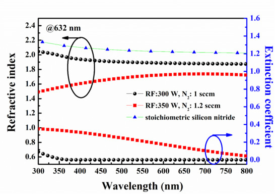 Ellipsometer spectra of SixNy ultra-thin films. For a nitridation time of 60 min, the refractive index (n) of SixNy film is close to 1.88 at 632 nm with RF: 300 W and N2: ~1 sccm.