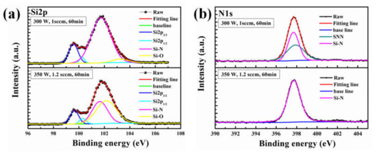 Two elemental species, Si, and N, were identified in the films by their corresponding signals observed in the XPS spectra. Figure 3 shows two samples of the Si 2p and N 1s spectra for the Si–N films prepared at various conditions. A Gaussian–Lorentzian sum function was used in the fitting, and the results are shown as red solid lines. The spectrum shows two main peaks at 99.5 and 101.78 eV. In order to investigate the Si-related peak in more detail, measurement and fitting were analyzed in a high-resolution spectrum. The peak in Si 2p and N 1s exhibit a slightly asymmetric shape, suggesting that they have several bonds other than Si–N in the SixNy layer. The asymmetric peaks were fitted by using a linear combination of Gaussian and Lorentzian line shapes commonly referred to as a pseudo-Voigt function [37]. The peak can be deconvoluted to three components (Figure 3a), which correspond to silicon nitride, silicon oxide, and silicon [38]. XPS spectra results indicated that the binding energy of Si 2p3/2 and Si 2p1/2 spin-orbit doublets located at around at 99.48 and 100.03 eV ± 0.1 eV and equal to 0.63 eV are characteristic of the Si–Si bonds. For the sample A (RF: 300 W with N2: 1 sccm), the spectra corresponding to the surface of Si show a strong peak at 101.7 eV, which is assigned to the binding energy of Si–N in the nitride compounds. Additionally, the weak broad peak centered at 103.18 ± 0.1 eV was attributed to Si–O–C and/or the silicon oxide band [39]. In previous reports, the N 1s peak for bulk Si3N4 was observed at 397.88 eV where the second nearest neighbor (SNN) was nitrogen [40], and N [Si(Si)3]3 was observed at 397.5 ± 0.2 eV with the Si atoms being SNNs to nitrogen [41]. On the other hand, thick SixNy (~7 nm) obtained for 60 min of nitridation with 350 W of RF power suggests that the diffusion length for the nitridant species across the nitrided Si and/or an amorphous SiO2 region was greater than the SixNy obtained. For the binding energies of Si and N in sample B, as shown in Figure 3a,b, the nitrided film can be clearly identified as SiNO. These results indicate that a higher process temperature offers more reactions between N radicals of the plasma and the Si atoms on the surface. The result is similar to that reported by Wu et al. [42].