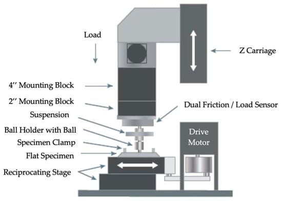 Five different tribological pairs were tested in a reciprocating ball-on-disc configuration (Figure 2). AISI 52100 steel balls (6 mm in diameter, Ra < 0.05 mm, HRC 58–66) were run against discs of tungsten carbide (WC6Co), cast iron (BS1452 240), bronze (PB1 BS 1400), aluminum (6082 T6) and steel (AISI 52100), respectively. All tests were carried out in a Bruker UMT3 tribometer (Billerica, MA, USA) with a duration of 30 min, at 25 °C and a relative humidity between 50 and 65%, at a frequency of 15 Hz, stroke length of 4 mm and load of 50 N (corresponding to a mean contact pressure of 1.03 GPa for the steel–aluminum pair, 1.62 GPa for the steel–steel pair, 2.14 GPa for the steel–WC pair, 1.29 GPa for the steel–cast iron pair, and 1.22 GPa for the steel–bronze pair). At the beginning of each test, 25 µL of the corresponding FAIL were deposited in the ball-disc contact. At the end of tests, the specimens were cleaned with heptane in an ultrasound bath for 5 min, rinsed in ethanol and dried with hot air. At least two replicates of each test were made. The friction coefficient was measured during tests.
