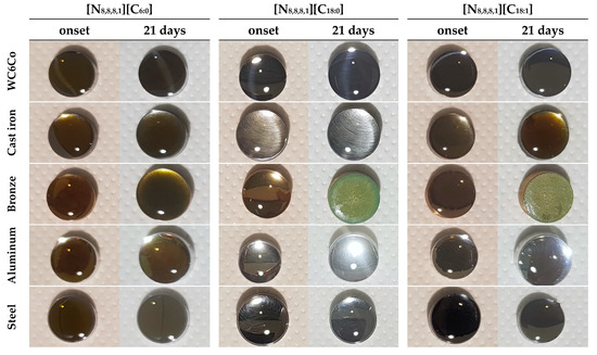 Finally, a research study [95] using three novel FAILs synthesized for lubrication purposes found that the alkyl chain length of the anion affects the chemical composition of the worn surface during tribological tests in four different material pairs (steel–steel, steel–aluminum alloy, steel–bronze and steel–tungsten carbide). Following this research line regarding the alkyl chain length effect, this study deals with three new fatty acid anion-based ionic liquids (FAILs): methyltrioctylammonium hexanoate ([N8,8,8,1][C6:0]), methyltrioctylammonium octadecanoate ([N8,8,8,1][C18:0]) and methyltrioctylammonium octadec-9-enoate ([N8,8,8,1][C18:1]), synthesized from natural sources and employed for the first time as neat lubricant in five material pairs (four of them used before [95]).