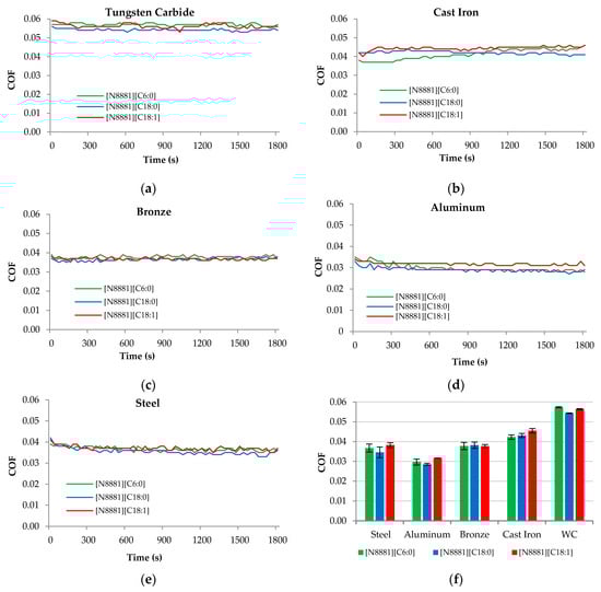 Figure 5 shows the evolution of the coefficient of friction during tribological tests carried out for each of the five material pairs. Additionally, the average values of the coefficient of friction obtained for every surface–FAIL combination are also included. In general, the friction coefficient remains steady during the tests, with an appreciable decrease only being detected during testing with the steel–aluminum pair lubricated with [N8,8,8,1][C6:0], probably due to the running-in process. The different friction coefficients obtained for the five material pairs can be related to the hardness of the lower specimen (disc). Likewise, the roughness and the Young’s modulus values of the five materials also led to friction differences. The higher the Young´s modulus, the higher the Hertz contact pressures, which results in lower lubricant film thicknesses, with the corresponding friction increase. The tungsten carbide–steel pair showed the highest friction value of the five material pairs tested, aluminum–steel showed the lowest, while steel–steel had an intermediate result. All these results are in agreement with their Hertz contact pressures.