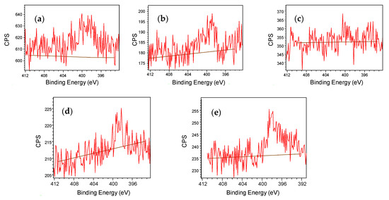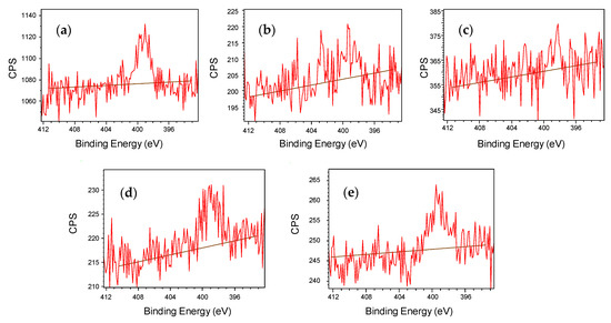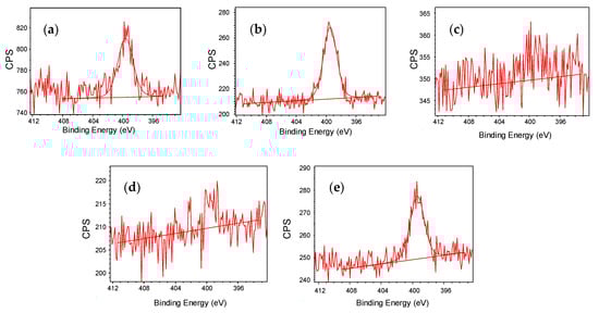 N1s spectra for the different samples lubricated with [N8,8,8,1][C18:0]. Images correspond to: (a) WC, (b) cast iron, (c) bronze, (d) aluminum and (e) steel.