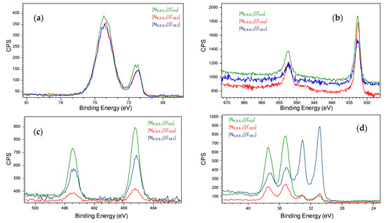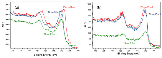 It is interesting that the signal-to-noise ratio in the case of samples tested with [N8,8,8,1][C18:0] and [N8,8,8,1][C18:1] is very poor in every case (Figure 8 and Figure 9), suggesting that the interaction between the ionic liquid and the surface is weaker.