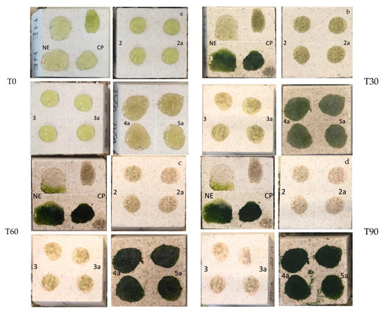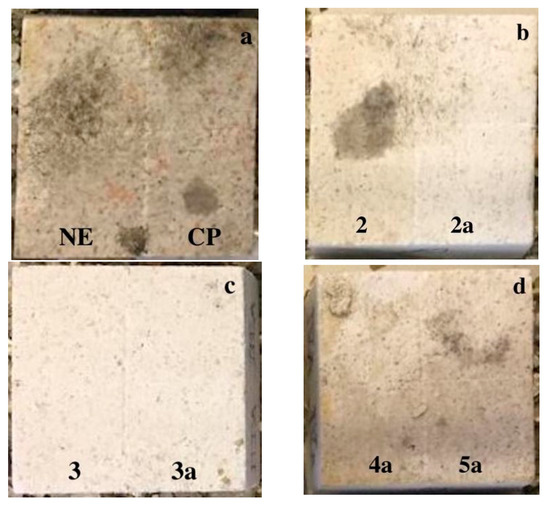 Spontaneous colonization of untreated and treated tufa probes after incubation for 90 days. (a) Untreated (CP) and NanoEstel treated (NE) probes: both show a remarkable fungal growth, visible as black stains; (b) 2 and 2a treated probes: the area treated with 2 is colonized by a black fungus, while that one treated with 2a is rather pristine; (c) 3 and 3a treated probes: no spontaneous colonization is observed; (d) 4a and 5a treated probes: spontaneous colonization is observed.
