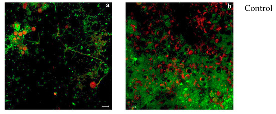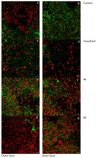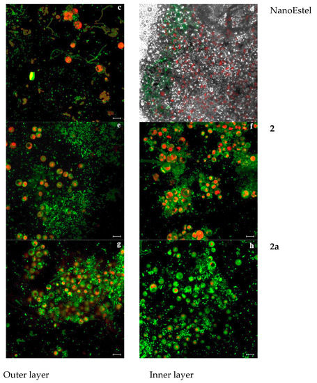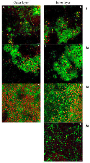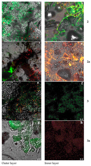 In detail, on the control the inner layer harbors a higher amount of microorganisms than the outer one (Figure 8a,b). This is also observed for the NanoEstel coating, on which the inner layer showed a dense fungal colonization (Figure 8c,d). On coatings with 2 (Figure 8e,f), algae and bacteria were visible in both the inner and outer layers; on coatings 2a (Figure 8g,h) besides the reduction of biofilm a certain sufference of algae as seen by the reduction of the red stain intensity; on those with 3, 3a, 4a and 5a (Figure 9) fungi were visible in the inner layer. An unexpected result was obtained with the specimen treated with 5a in which, the biofilm was macroscopically dark green (Figure 7d), but only few living algae were observed (Figure 9g).